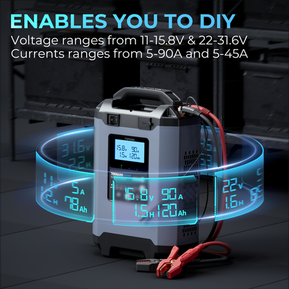 Charge a wide variety of 12V and 24V batteries, such as AGM, WET, GEL, MF, CAL, EFB, and Lithium batteries. The Tornado90000 is suitable for batteries between 5 and 90 amps.