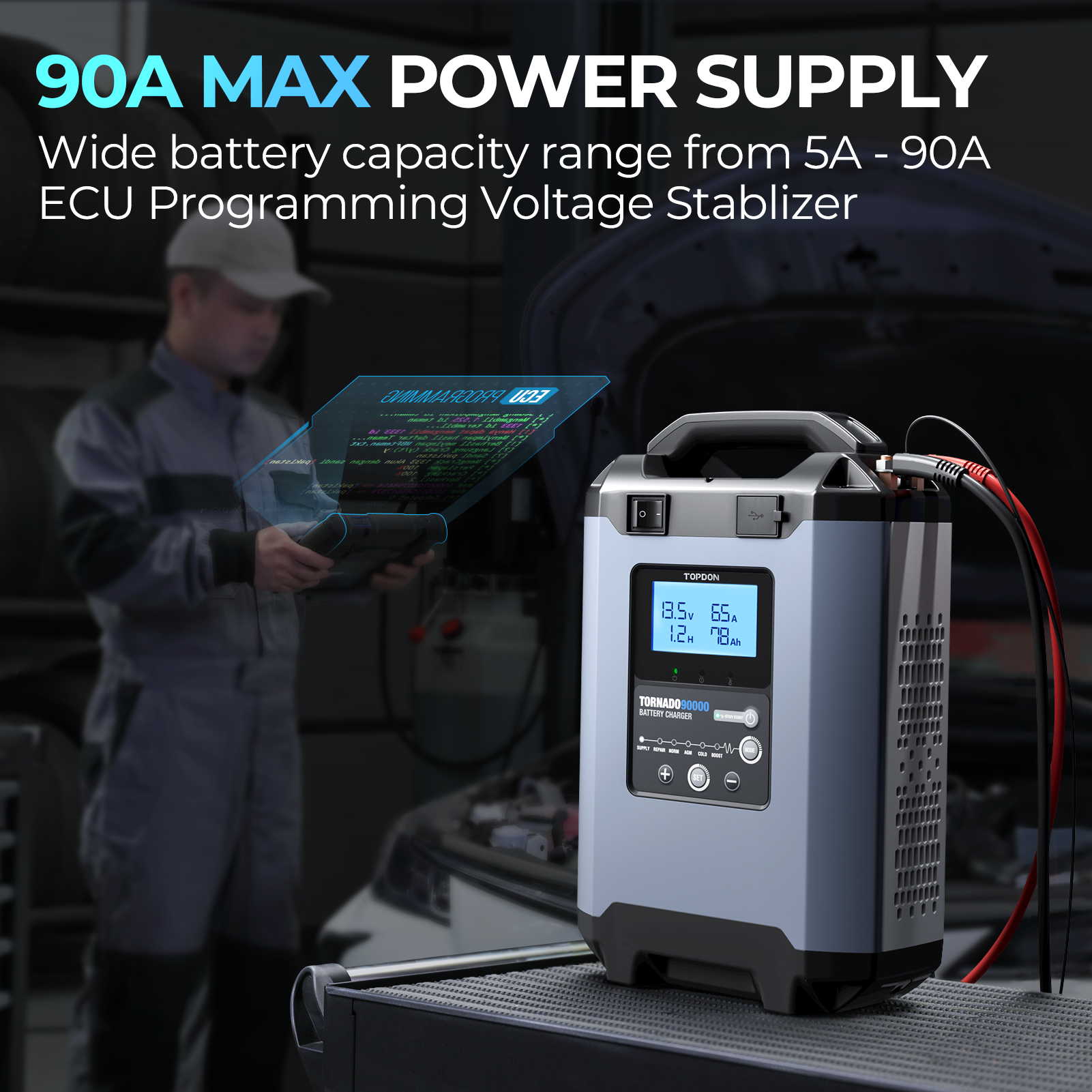 The Tornado90000 is TOPDON's newest cutting-edge smart charger, made for professional and commercial users. This device is suitable for all types of 12V and 24V lead-acid and lithium batteries, with a wide battery capacity range from 5 to 90 amps.