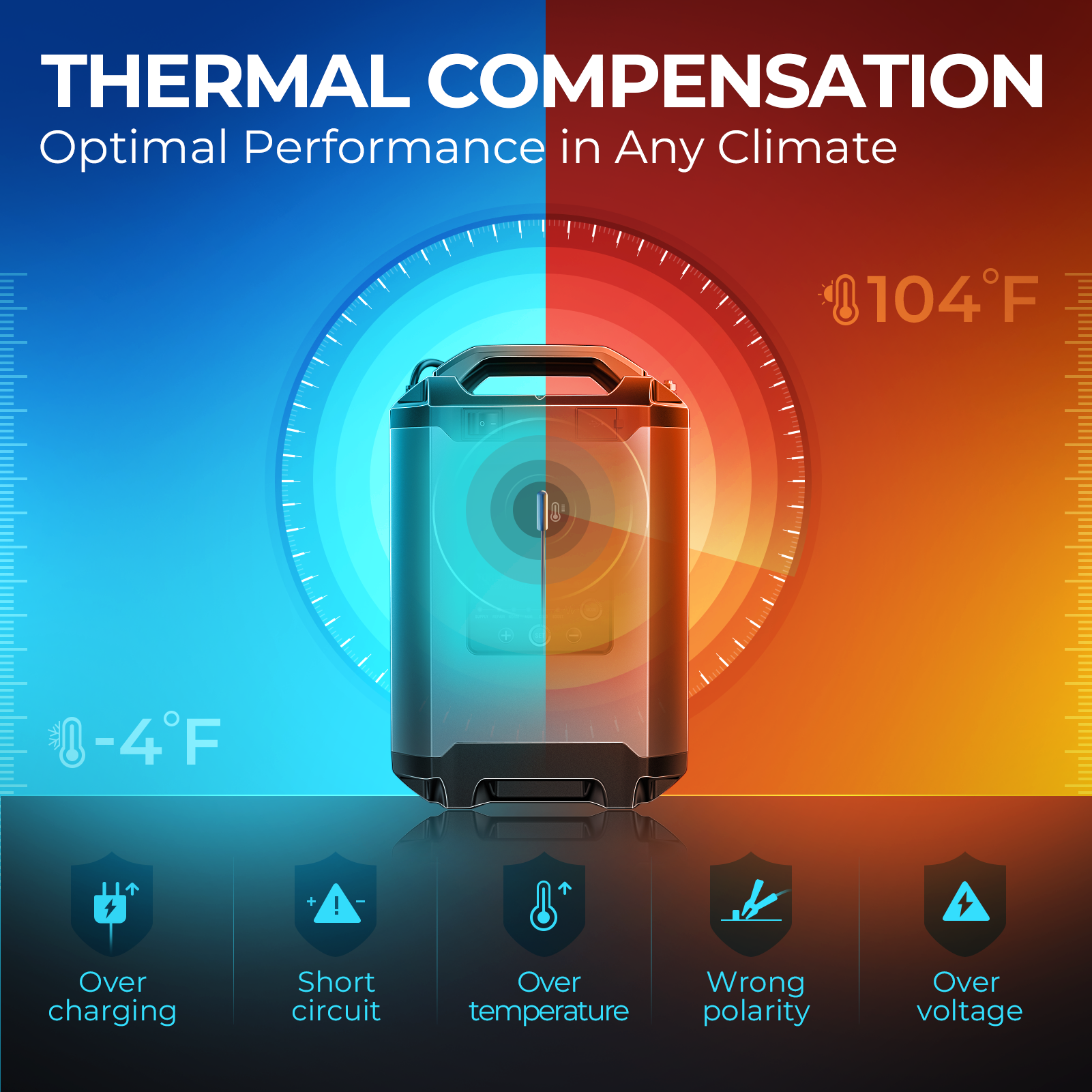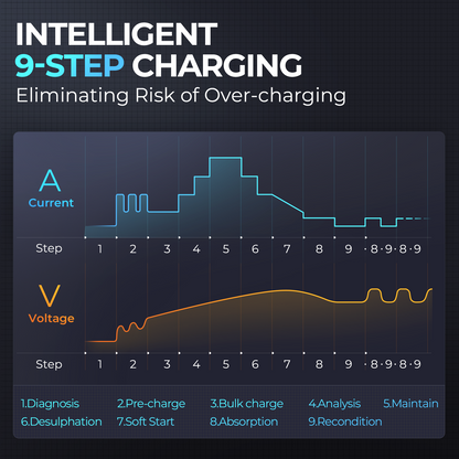 Its "9-step smart charging" provides strong protection to the battery and the automatic charging and disconnection system eliminates any risk of overcharging.