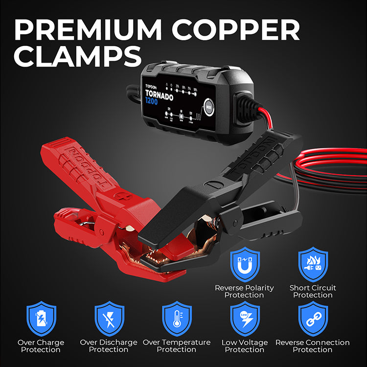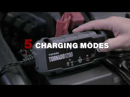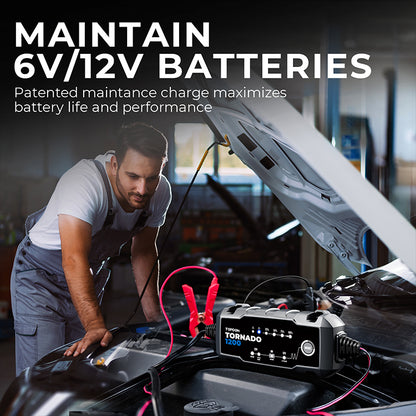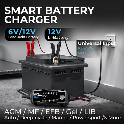 The Tornado1200 is a 6V & 12V Lead-Acid Battery and Lithium-Ion Battery charger. This versatile all-in-one product features a battery maintainer, trickle charger, and battery desulfator. This low-cost device will give you the best possible maintenance technology for your battery. The Tornado1200 offers multi-step protection for small and large batteries even in cold temperatures, and a rugged, water-resistant enclosure. These features make this a durable battery charger that will last longer and save you money in the long run.