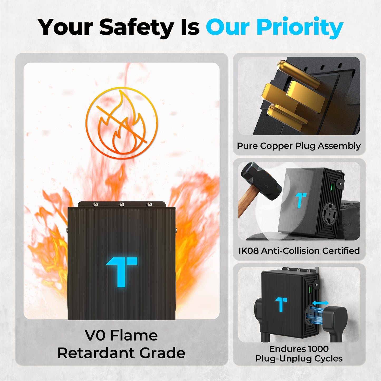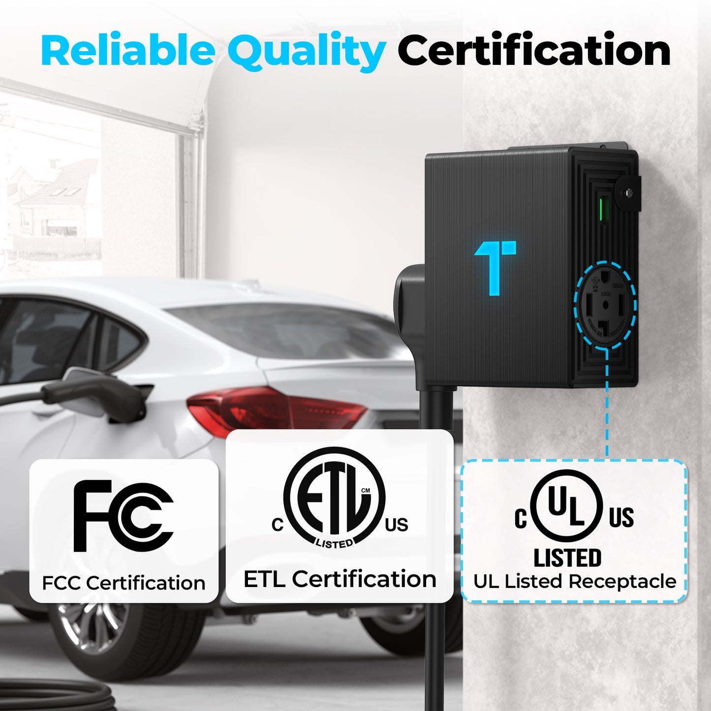 The PulseQ NEMA Splitter ensures safety with overload protection, short circuit protection, and overheating protection. Devices and your home are safeguarded from overcurrents and overheating. The splitter is FCC and ETL certified, confirming safety and compliance.