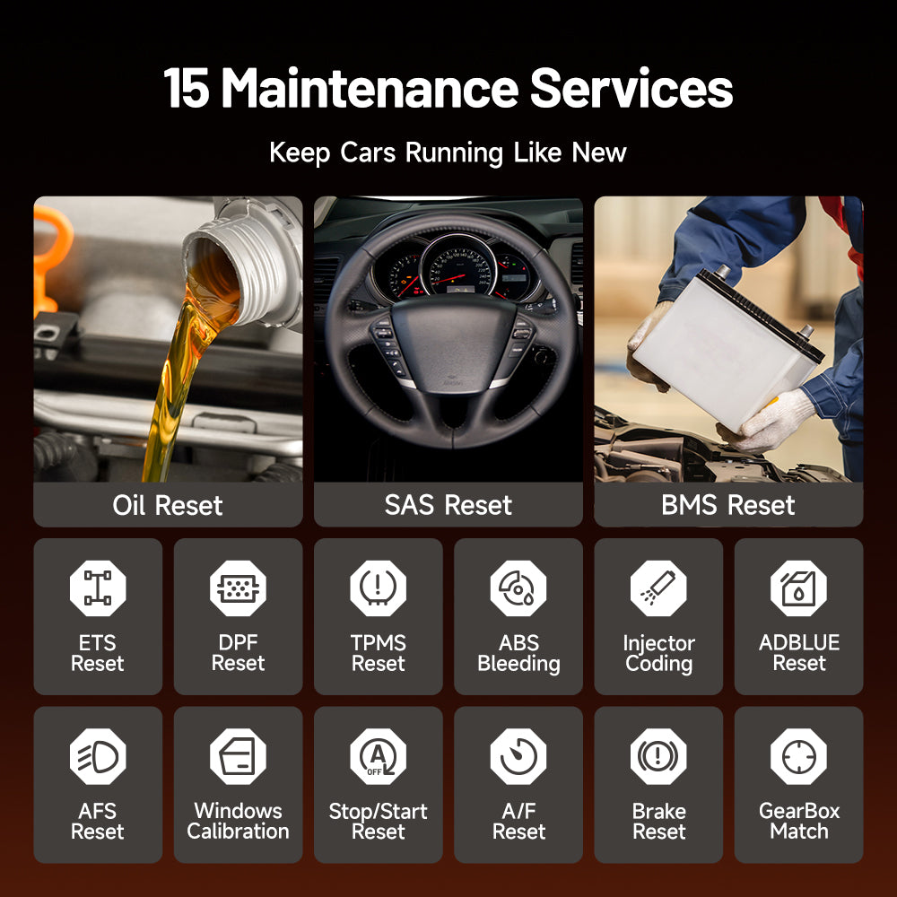 From oil resets to gearbox matching, this scanner integrates 15 maintenance functions to comprehensively care for your vehicle. Whether it's routine maintenance like resetting the oil light and bleeding the brakes, or advanced operations like calibrating windows and matching the gearbox, you can easily handle and keep vehicle stays in top condition.
