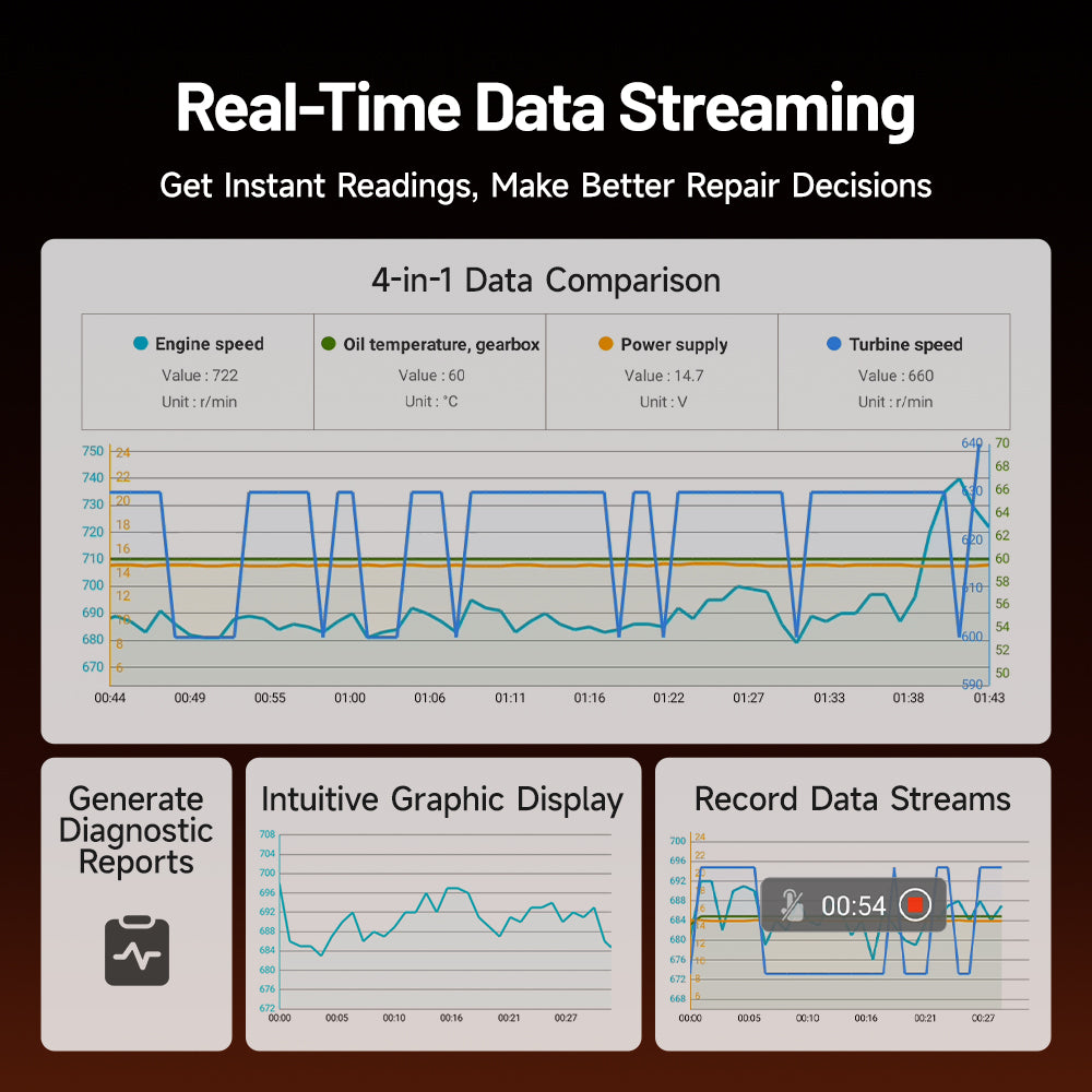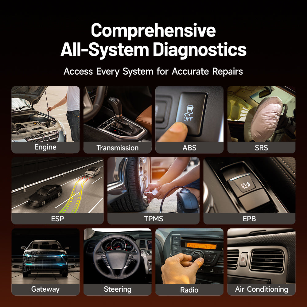 Diagnose every corner of vehicle systems with full-System diagnostics and get complete visibility into trouble codes, ECU information, and real-time performance. This comprehensive coverage helps you perform accurate diagnosis, identifying problems early and ensuring a quicker repair process.