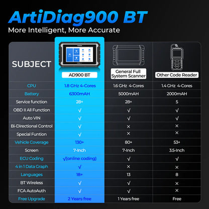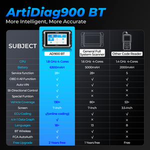 The ArtiDiag900 BT features a 4-core 1.8GHz CPU for enhanced speed and efficiency. With a 6300mAh battery offering up to 11 hours of battery life, it ensures smooth operation during automotive diagnostics.