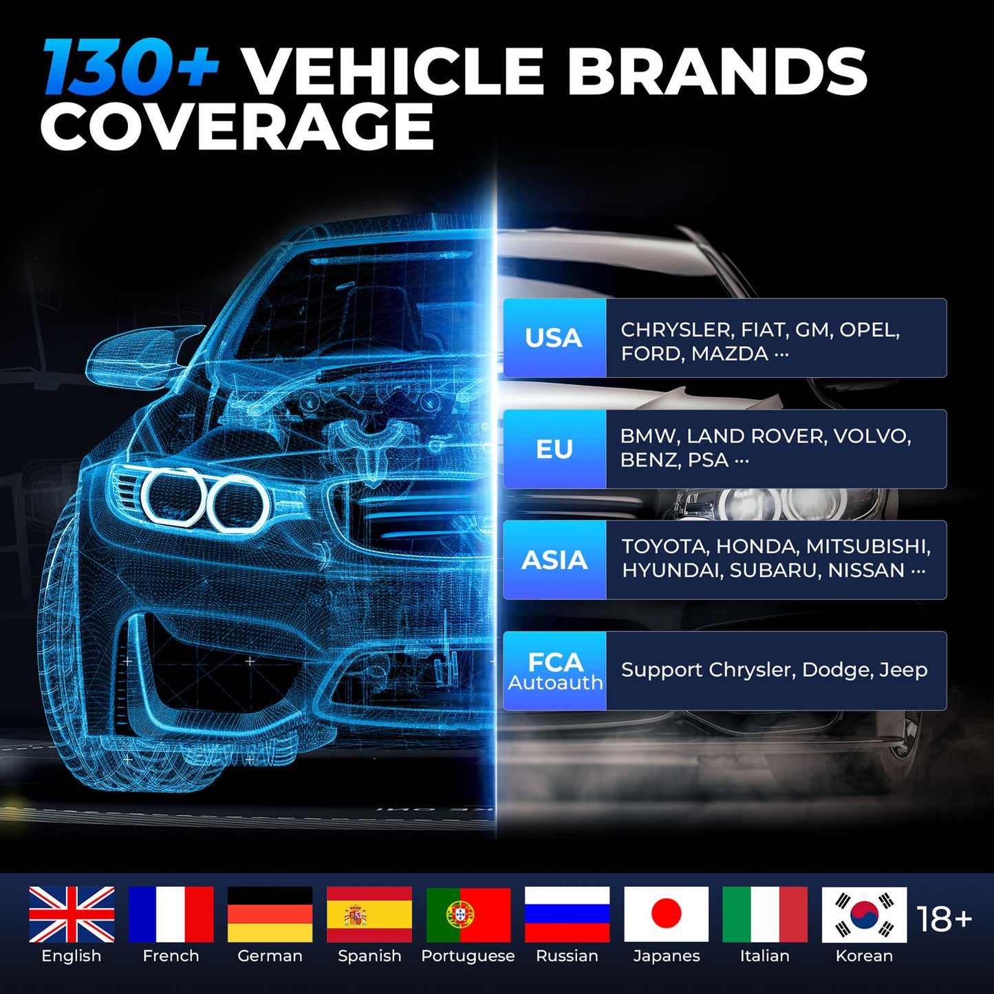 Performs comprehensive scans on over 130 brands including BMW, BENZ, JAGUAR, CHRYSLER, FIAT, GM, FORD, HONDA, and more. Features include reading module information, clearing fault codes, and data stream analysis for all systems.