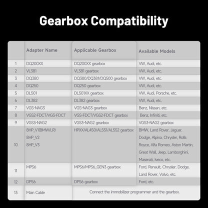 Designed for automotive professionals, this Gearbox Cloning Adapter Kit enables direct, secure connections to gearbox ECUs across major vehicle brands. Simply select the corresponding adapter, plug it into the Gearbox ECU, and clone seamlessly with your T-Ninja Box.