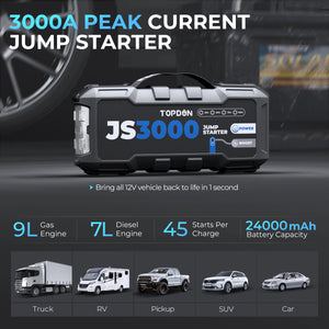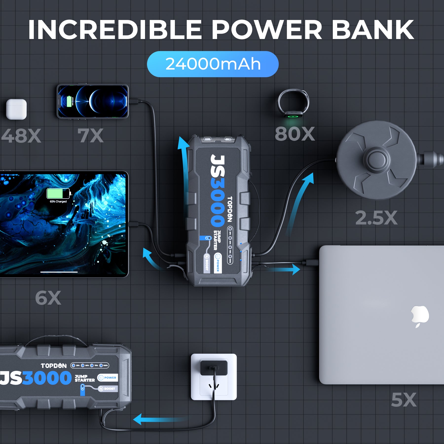 Utilize 3000 Peak cranking amps to provide life-saving jumps in just 1 second. With a 24000mAh battery capacity, you can achieve up to 45 jumps per single charge. It can revive up to 9L gas and 7L diesel vehicles.
