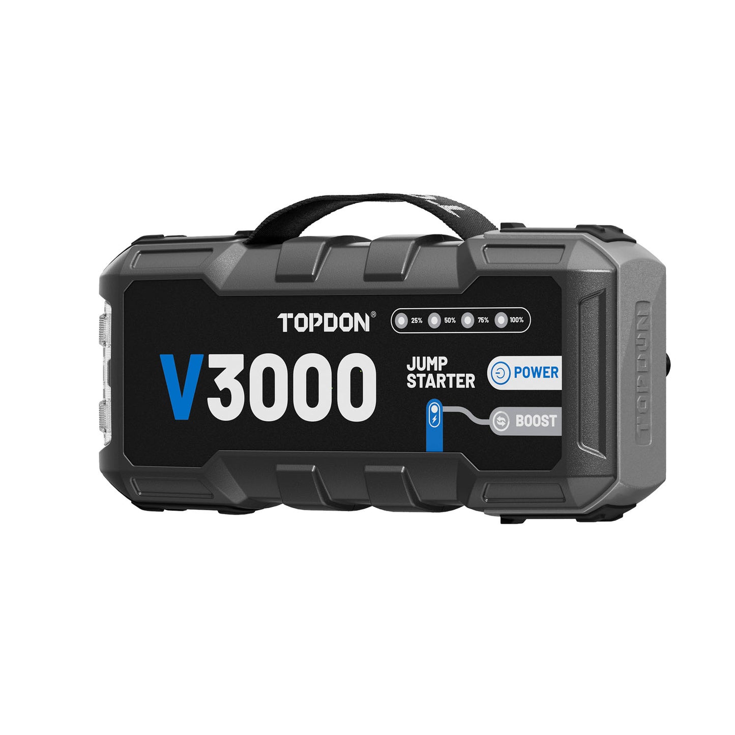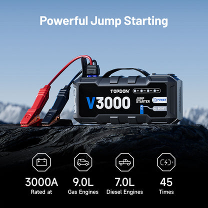 The TOPDON V3000 is an upgraded version of the popular JS3000. This professional-grade, heavy-duty lithium jump starter delivers 3000A peak current and is powered by a 24,000mAh battery. It jump-starts gas engines up to 9.0L and diesel up to 7.0L with ease. Designed for 12V vehicles like cars, trucks, SUVs, and boats, the V3000 ensures reliable starts anytime, anywhere, even in extreme conditions.